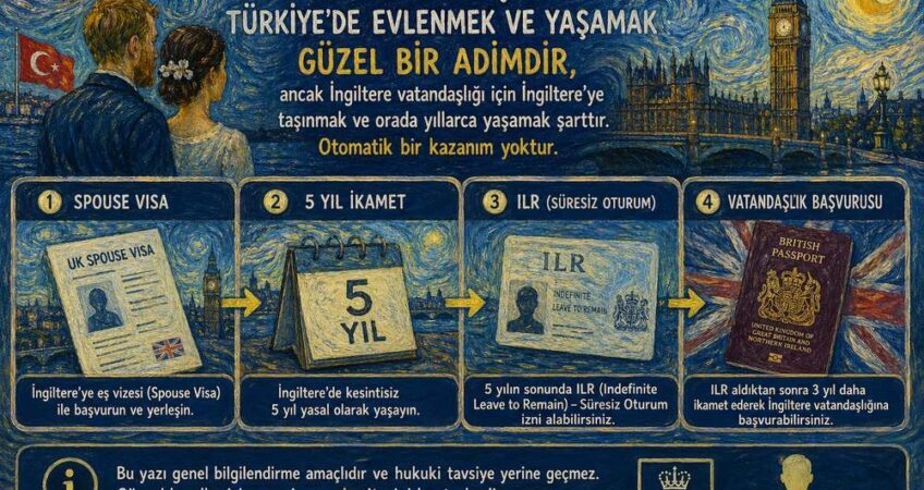 İngiliz vatandaşıyla Türkiye’de evlenmek ve yaşamak güzel bir adımdır, ancak İngiltere vatandaşlığı için İngiltere’ye taşınmak ve orada yıllarca yaşamak şarttır. Otomatik bir kazanım yoktur. Önce Spouse Visa ile İngiltere’ye yerleşin, 5 yıl ILR alın, ardından 3 yıllık ikametle vatandaşlığa başvurun.